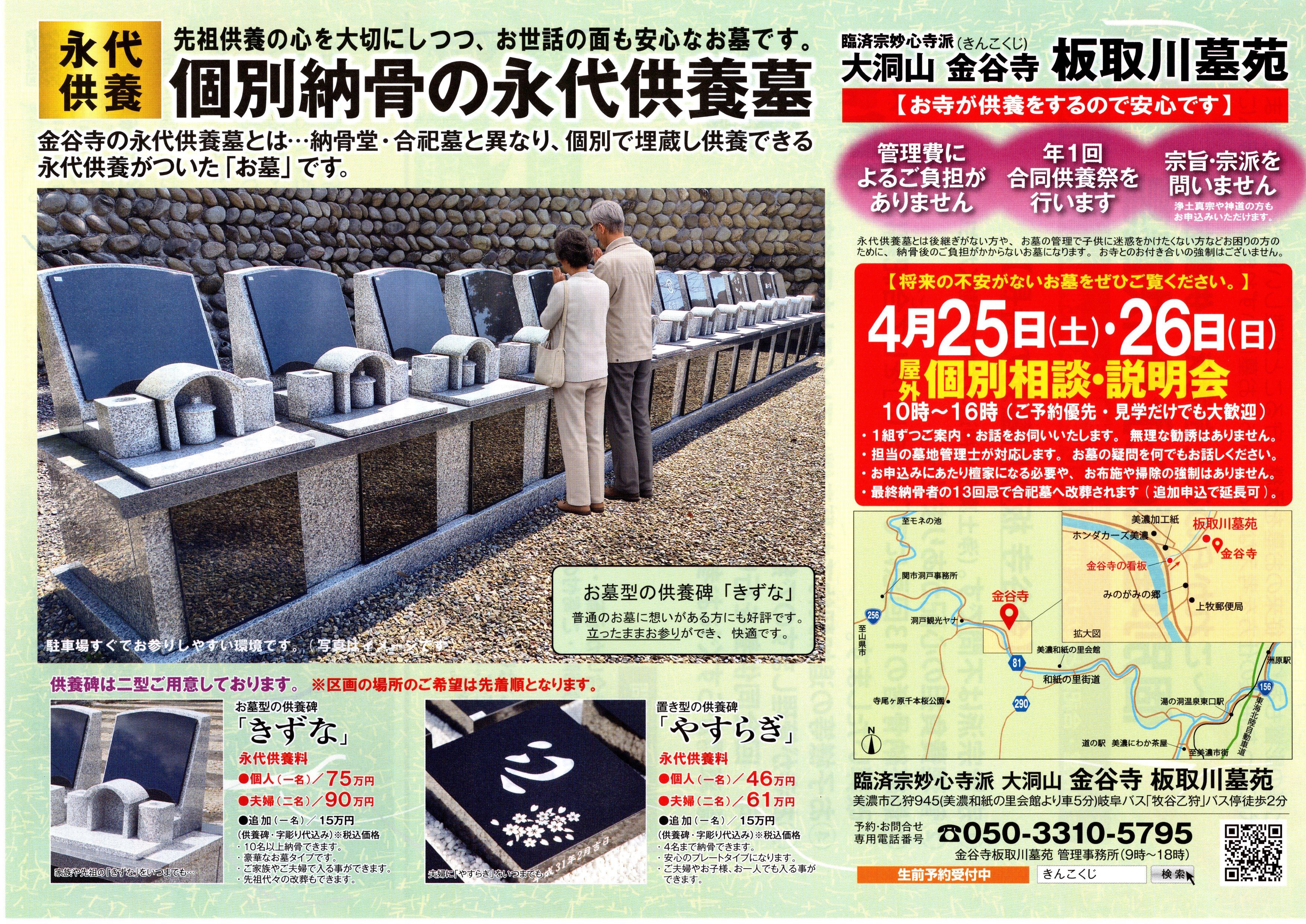 美濃市乙狩(美濃和紙の里会館から車4分)金谷寺板取川墓苑」に待望の個別埋蔵できる永代供養墓誕生。