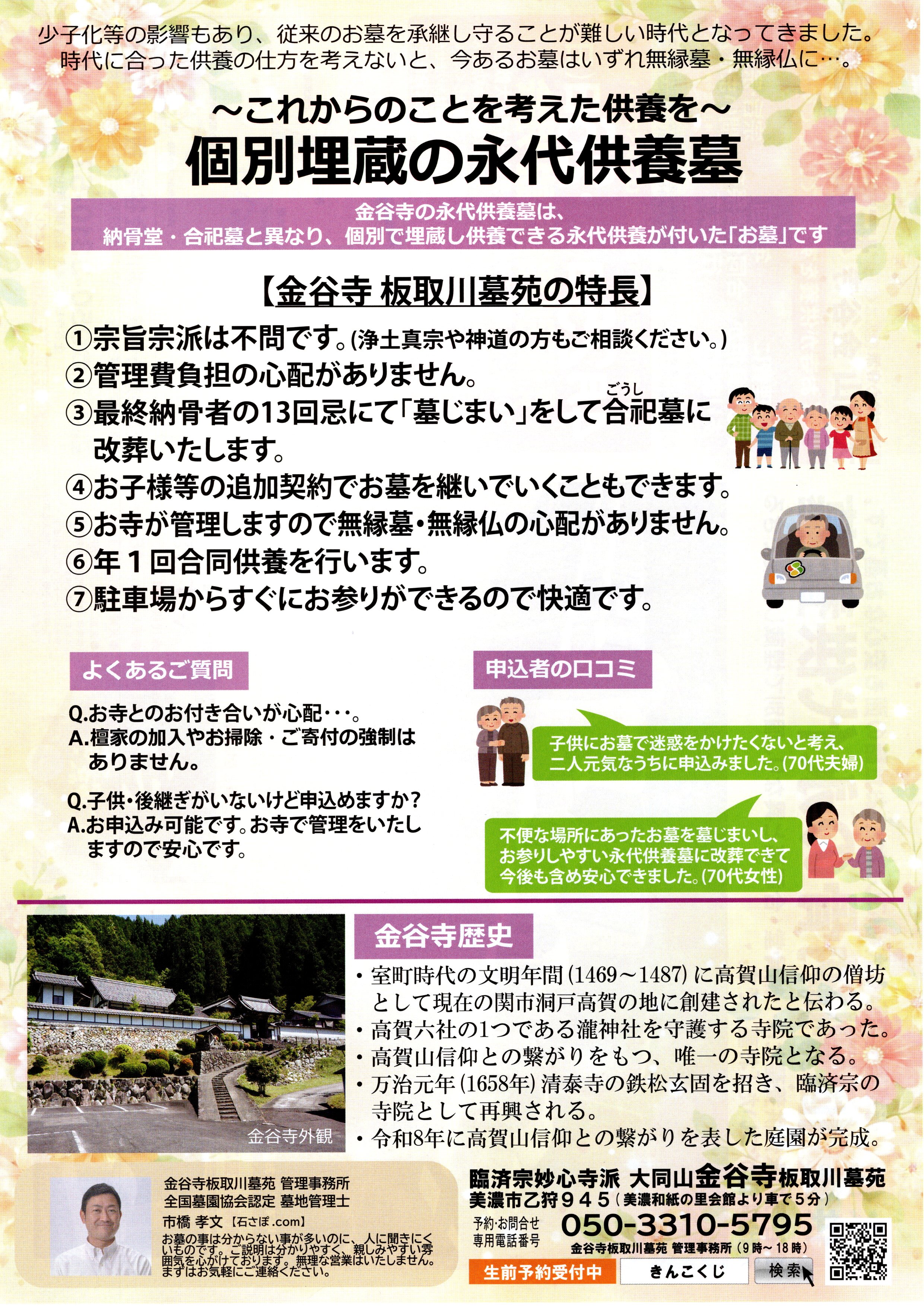 【☎ 050-3310-5795】(金谷寺板取川墓苑 管理事務所)
